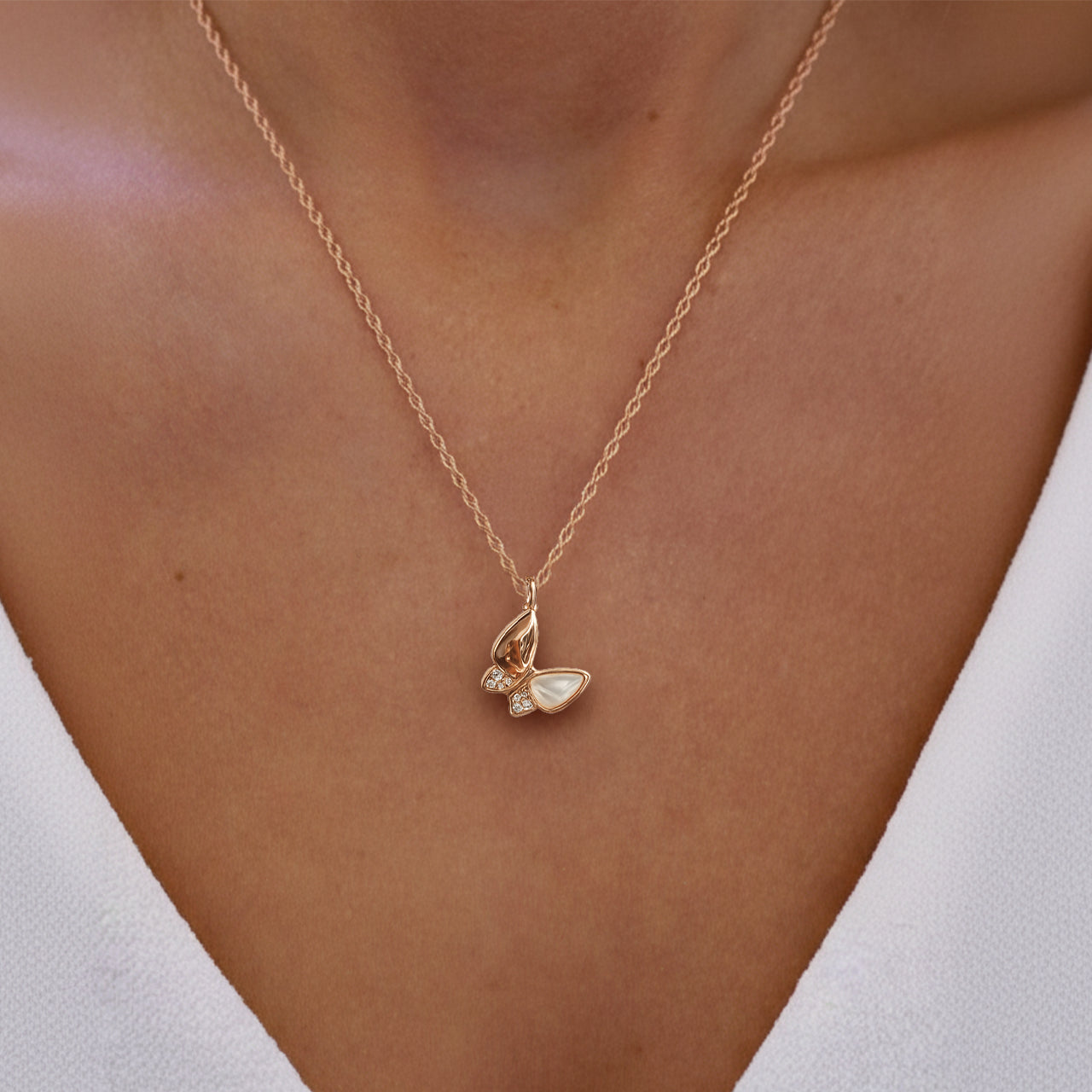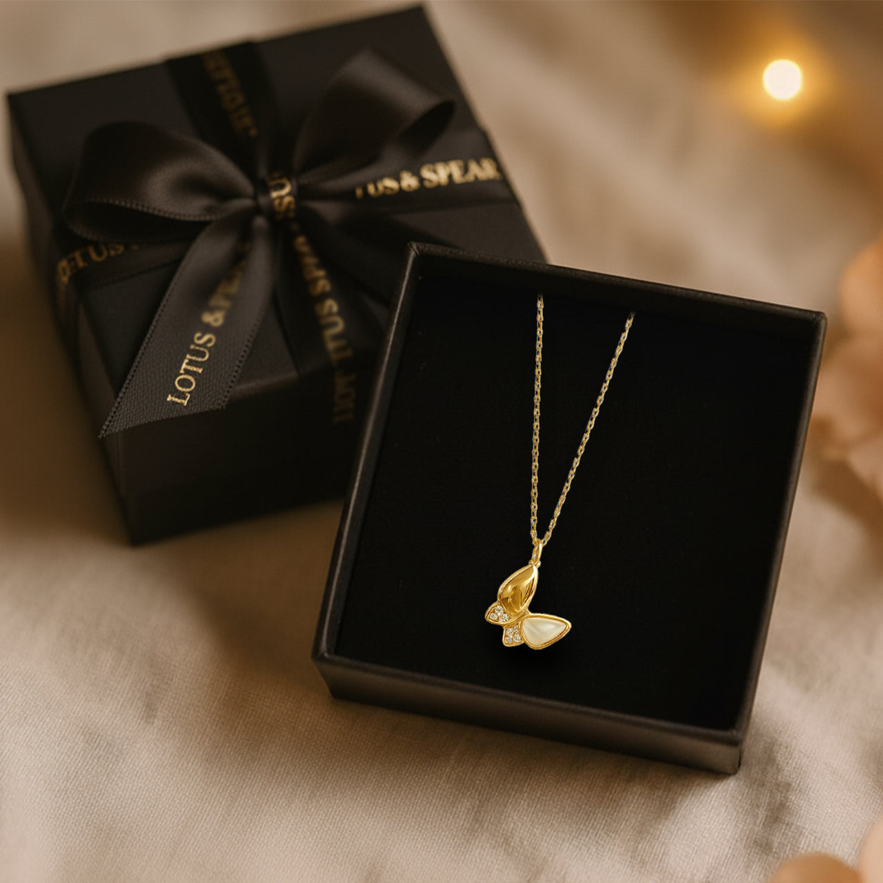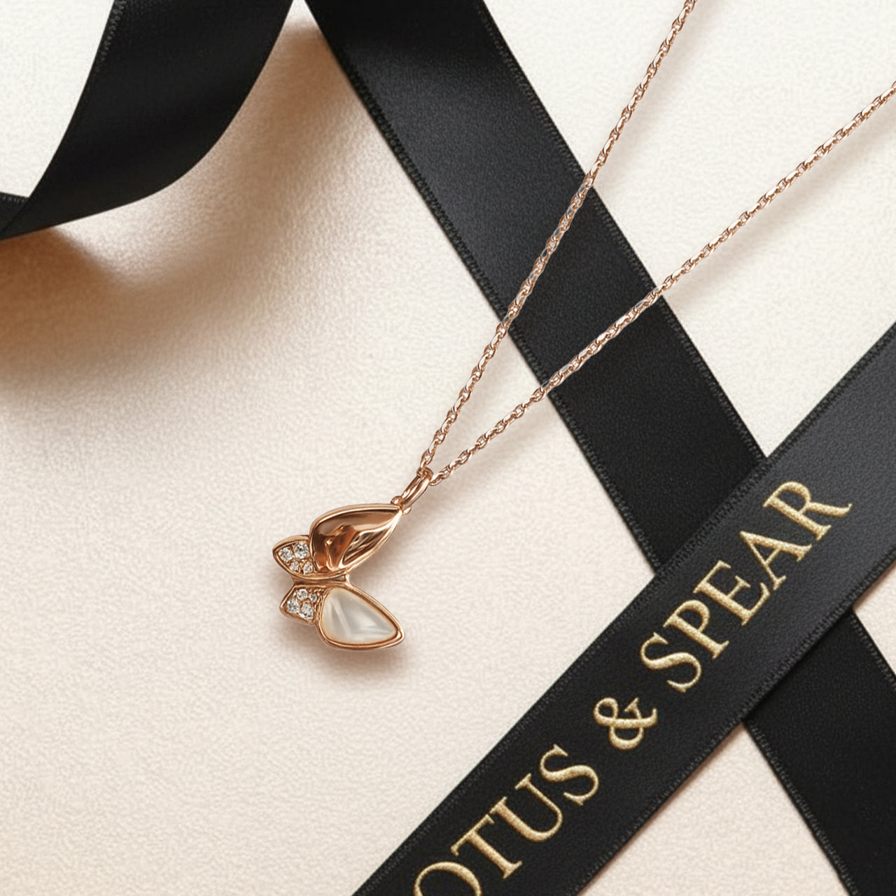 - Butterfly-inspired pendant symbolising transformation and grace.