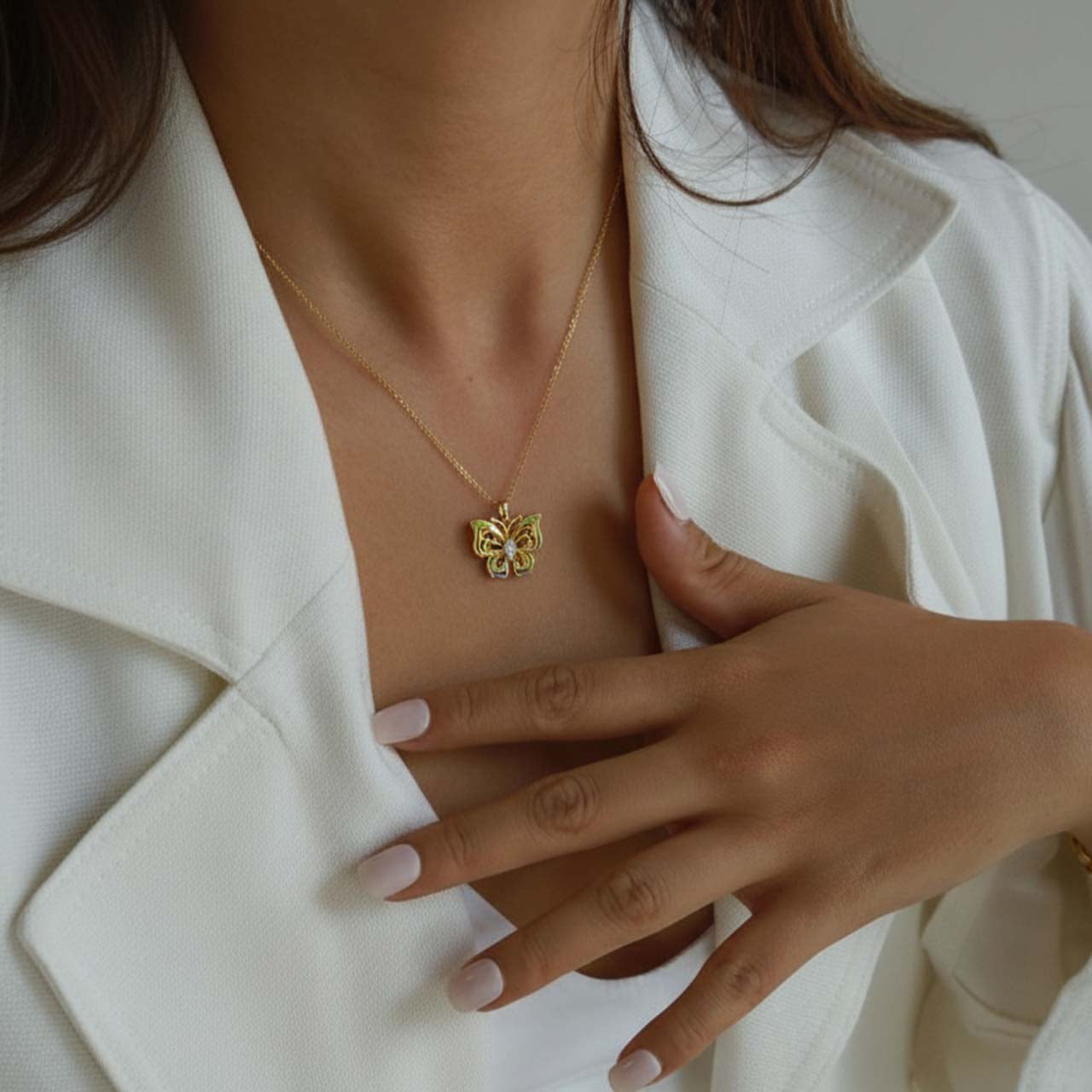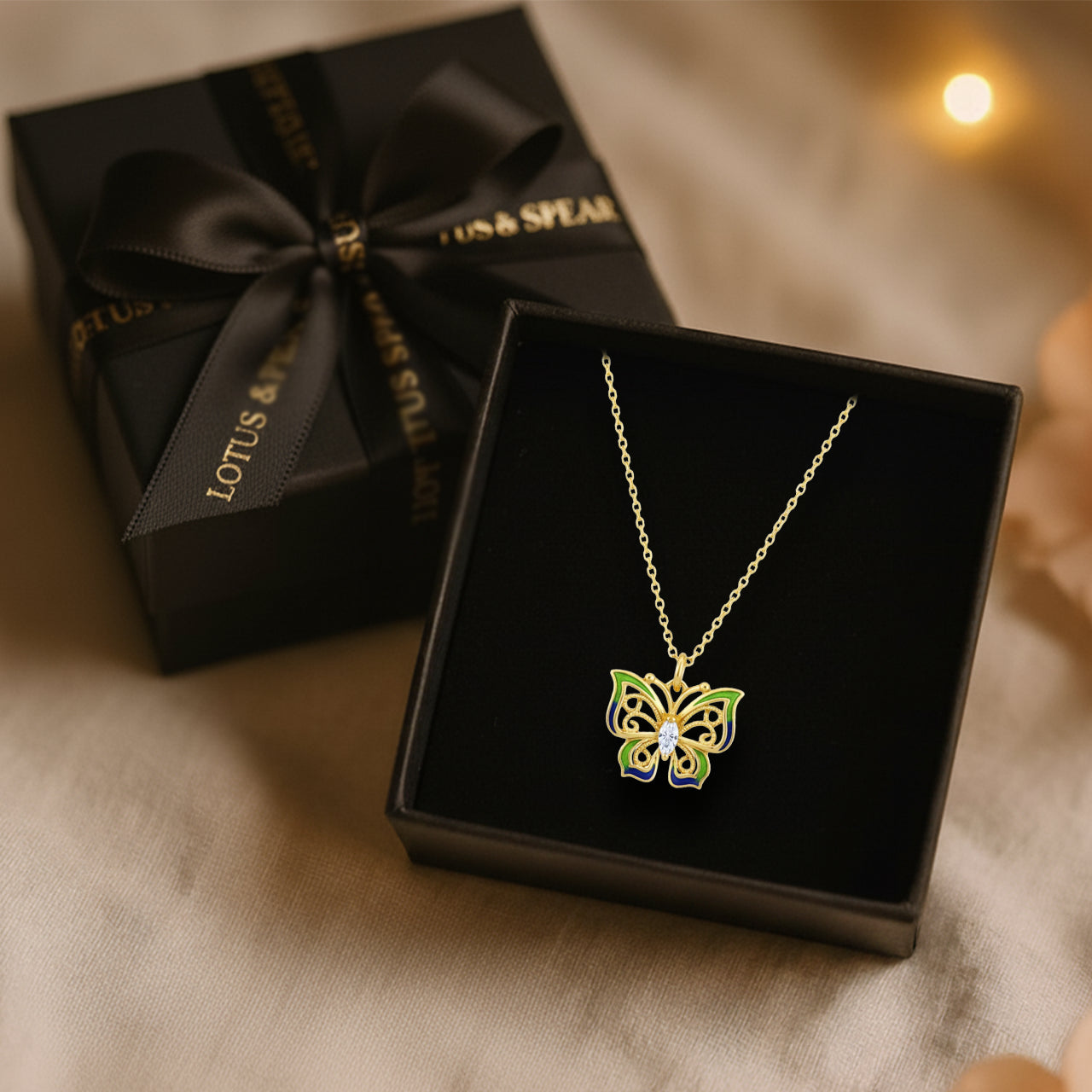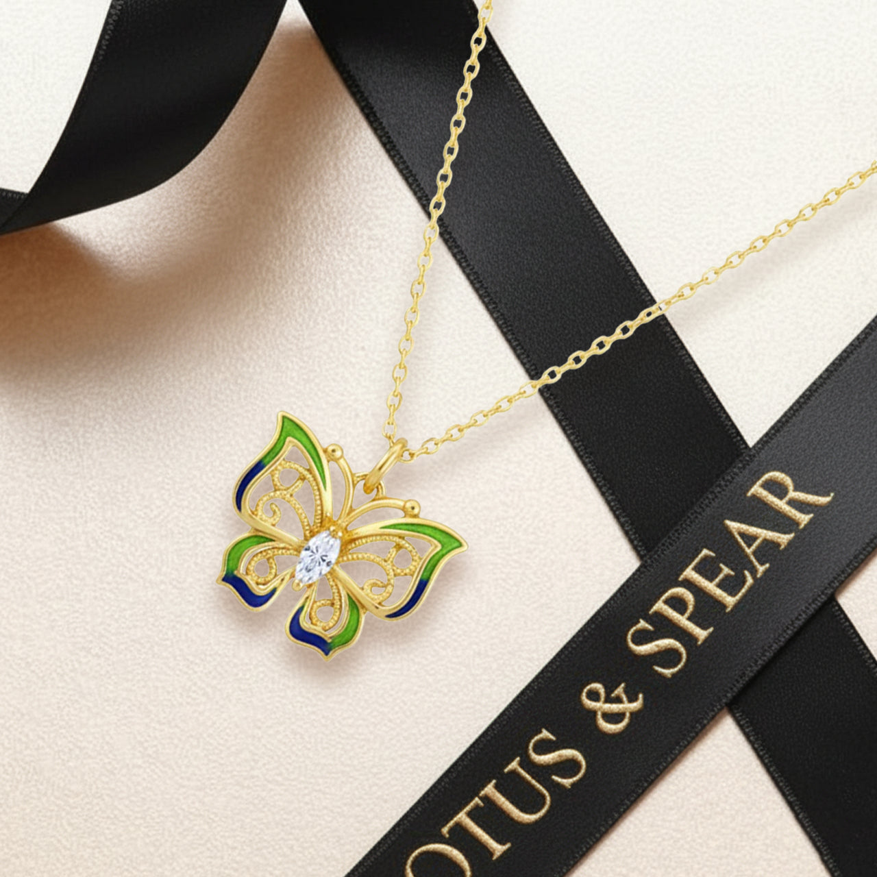A symbol of renewal and transformation, The Wings of Grace Necklace captures the delicate beauty of a butterfly mid-flight — its wings adorned with serene hues of green and gold. Designed for those who embrace change with grace and courage.