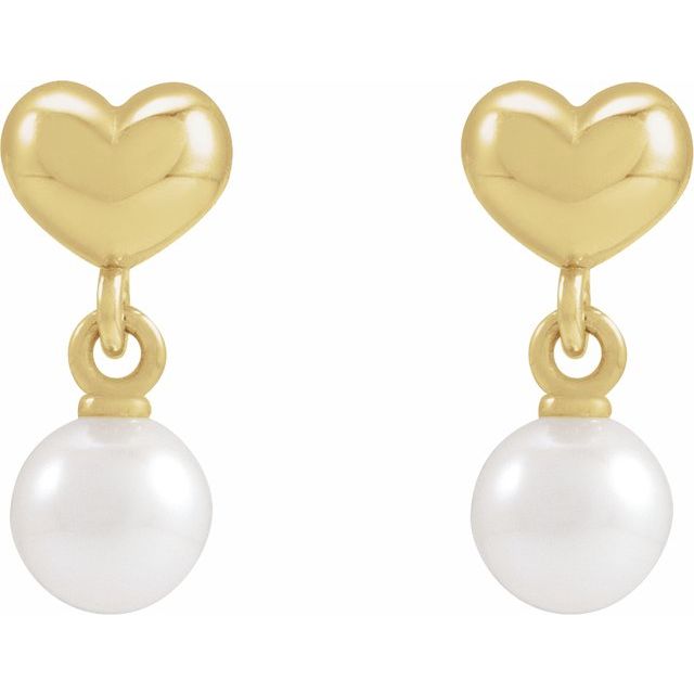 14K Yellow Cultured White Freshwater Pearl & Heart Dangle Earrings