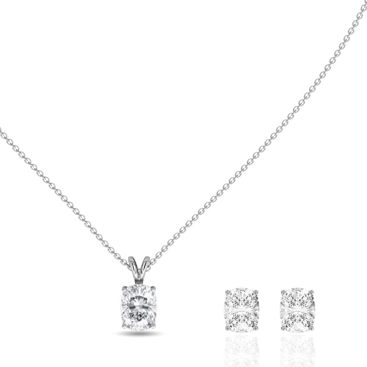 This exquisite pendant set features a stunning combination of GIA Certified Natural diamonds and luxurious 18k gold. The centerpiece is a 2.00ct Long Cushion brilliant diamond of F color and SI clarity, elegantly set in an 18k gold pendant and suspended from a 16" cable chain. Paired with matching Long Cushion-shaped natural diamond stud earrings, also crafted in 18k gold, the set offers a total diamond weight of 2.00 carats, providing a radiant and timeless sparkle. Each piece is designed to elevate your style with both luxury and simplicity, making it perfect for everyday elegance or special occasions. Secure push backings on the earrings ensure comfort and ease, making this set a sophisticated choice for any jewellery lover.