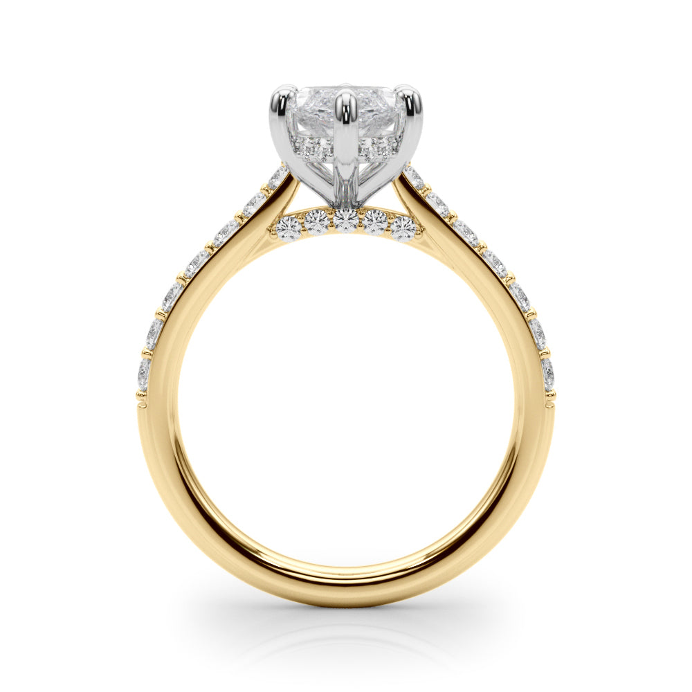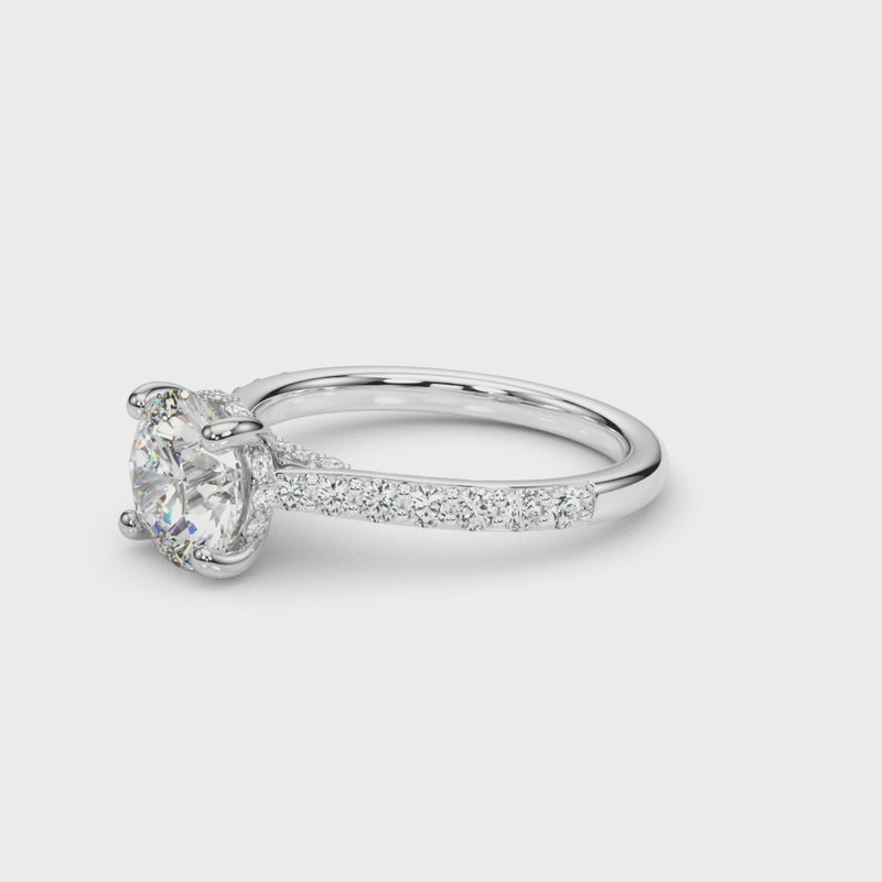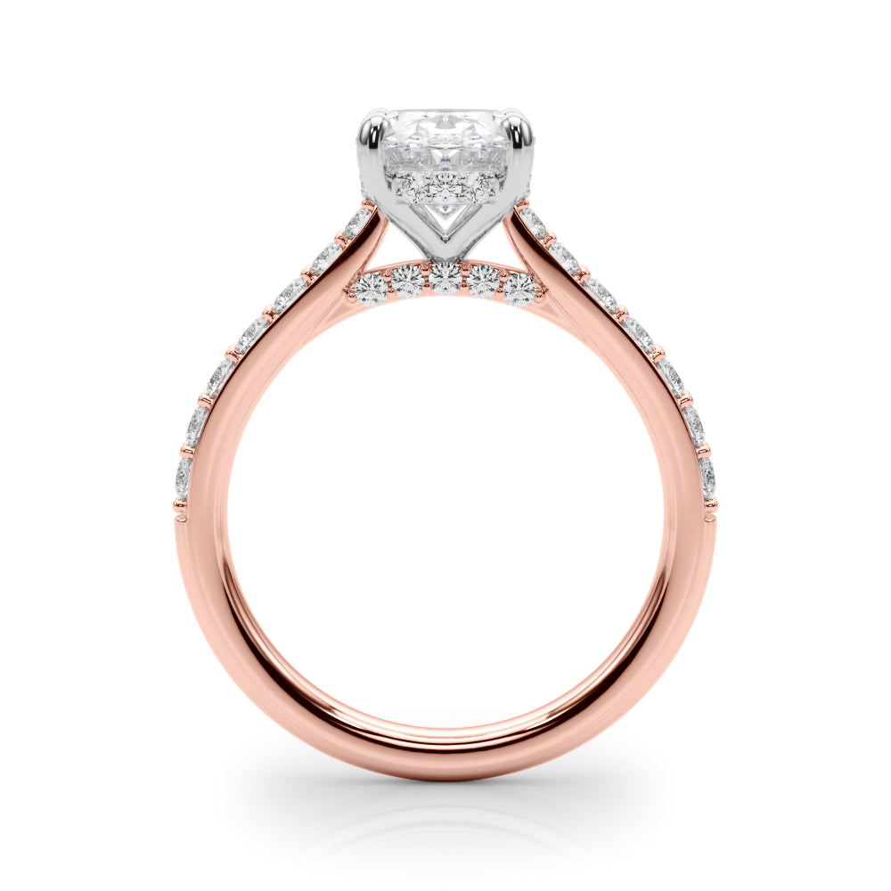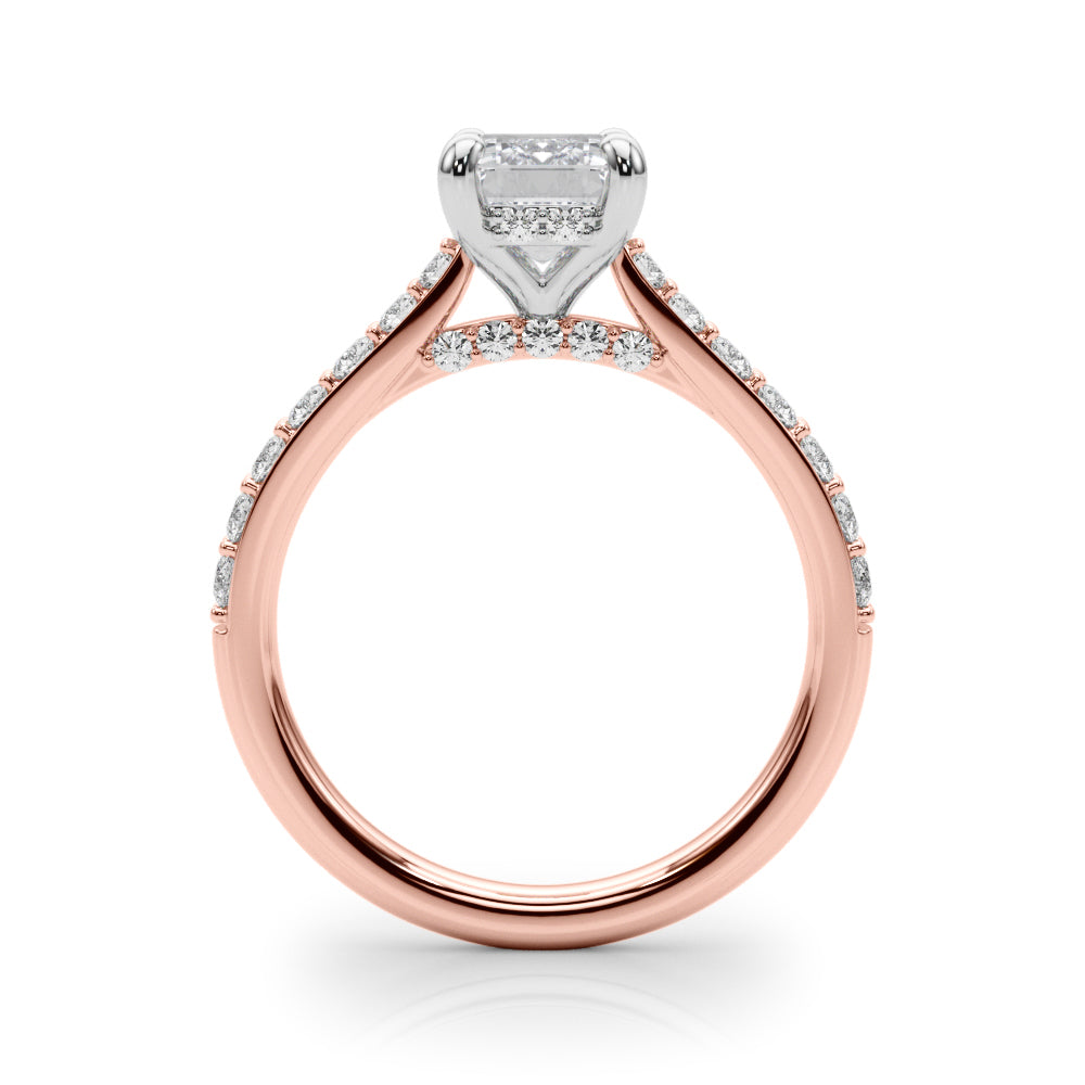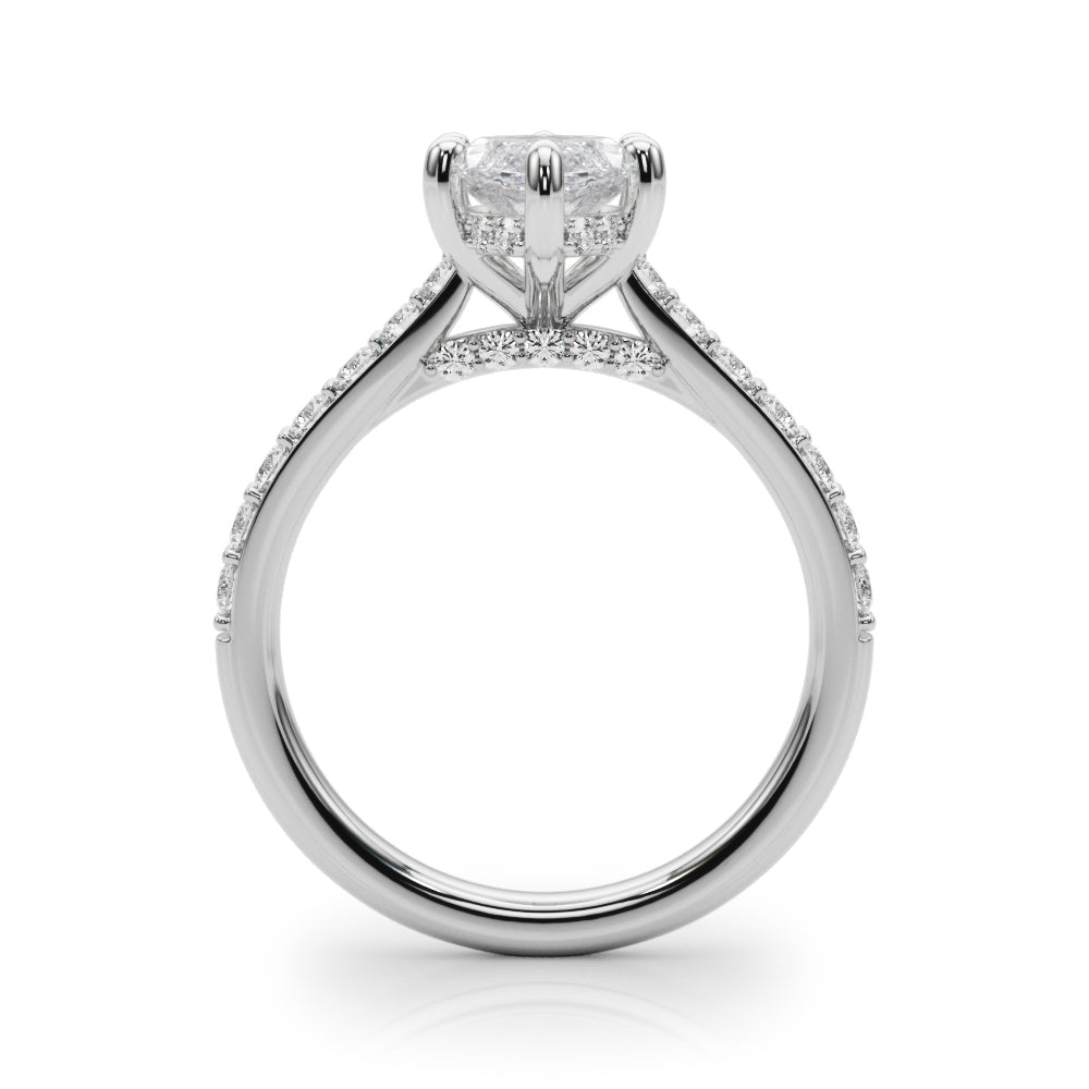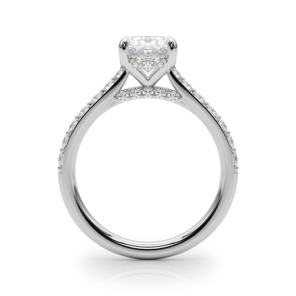 This exquisitely crafted ring showcases a graceful, tapered band accented with pavé-set diamonds, leading to an intricately detailed under-gallery. The raised setting adds a refined architectural touch, blending strength with elegance. A timeless piece designed for those who appreciate subtle sophistication and expert craftsmanship.