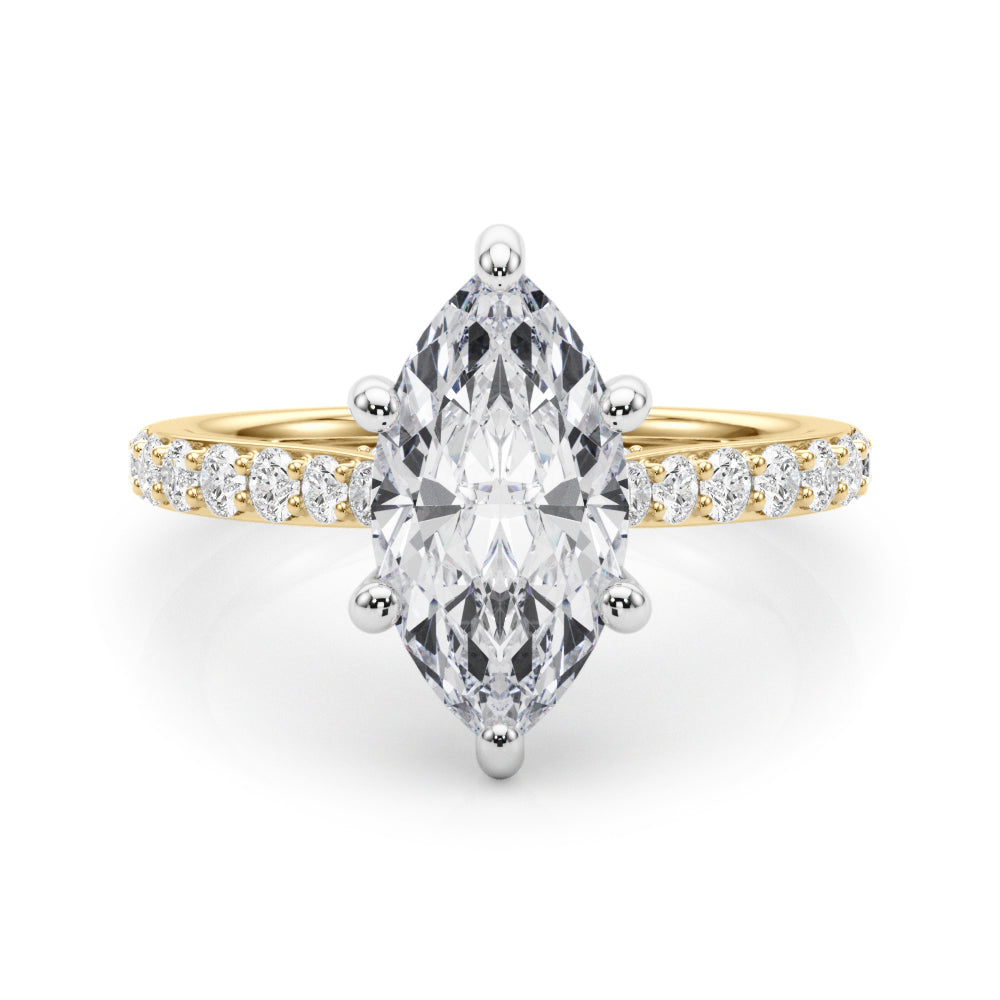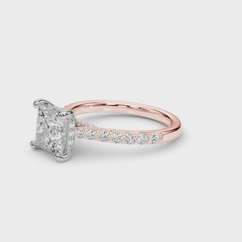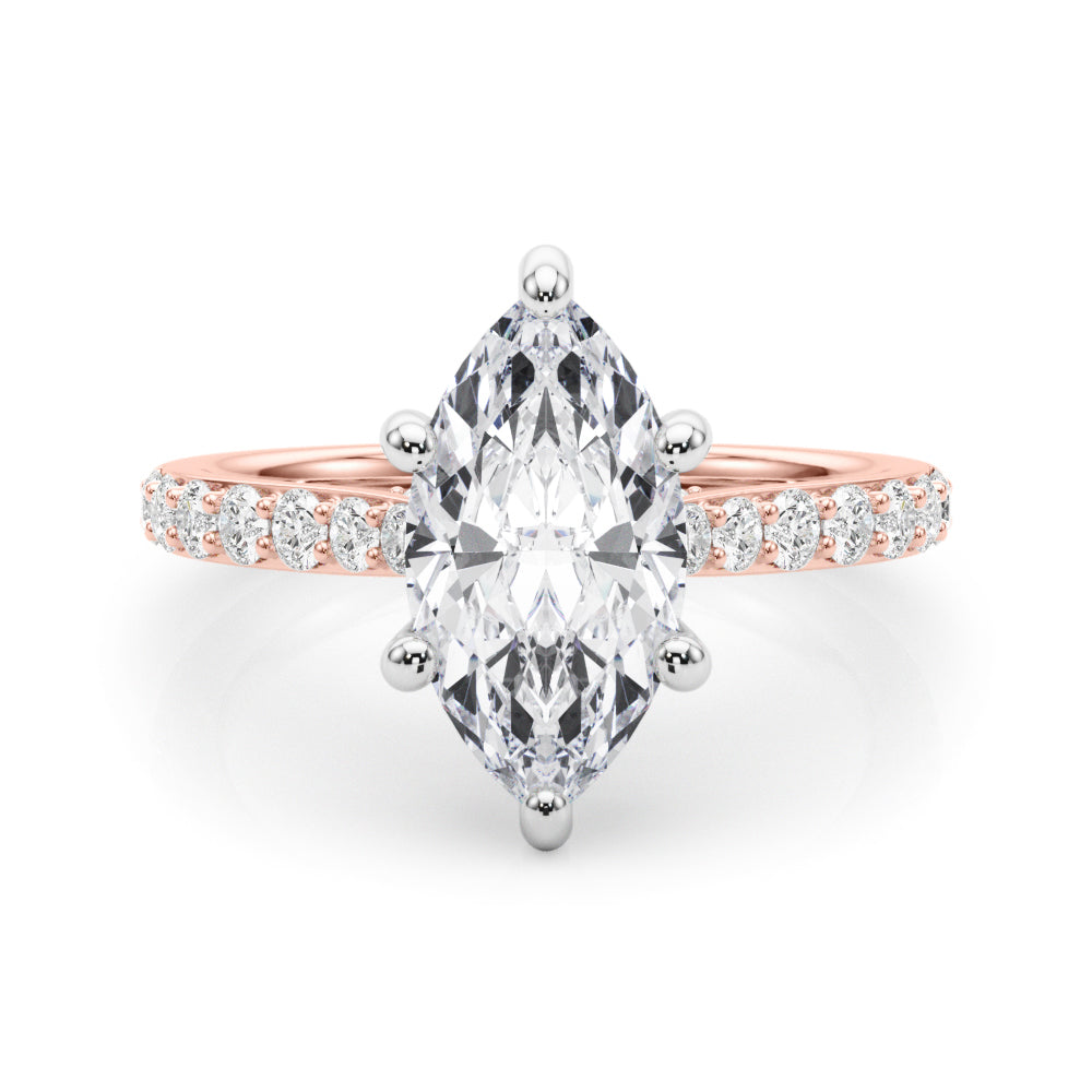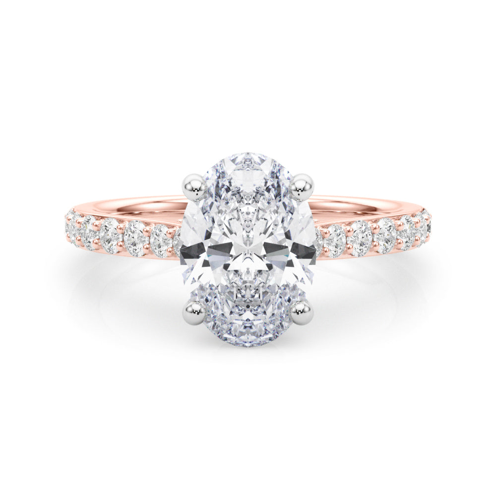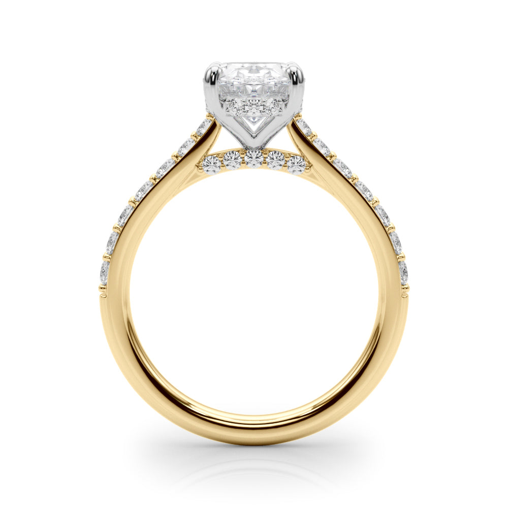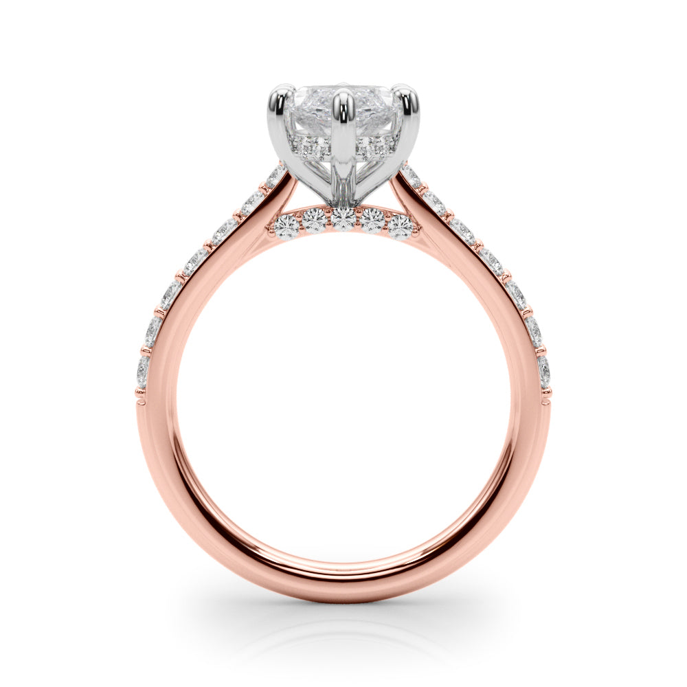 This exquisitely crafted ring showcases a graceful, tapered band accented with pavé-set diamonds, leading to an intricately detailed under-gallery. The raised setting adds a refined architectural touch, blending strength with elegance. A timeless piece designed for those who appreciate subtle sophistication and expert craftsmanship.