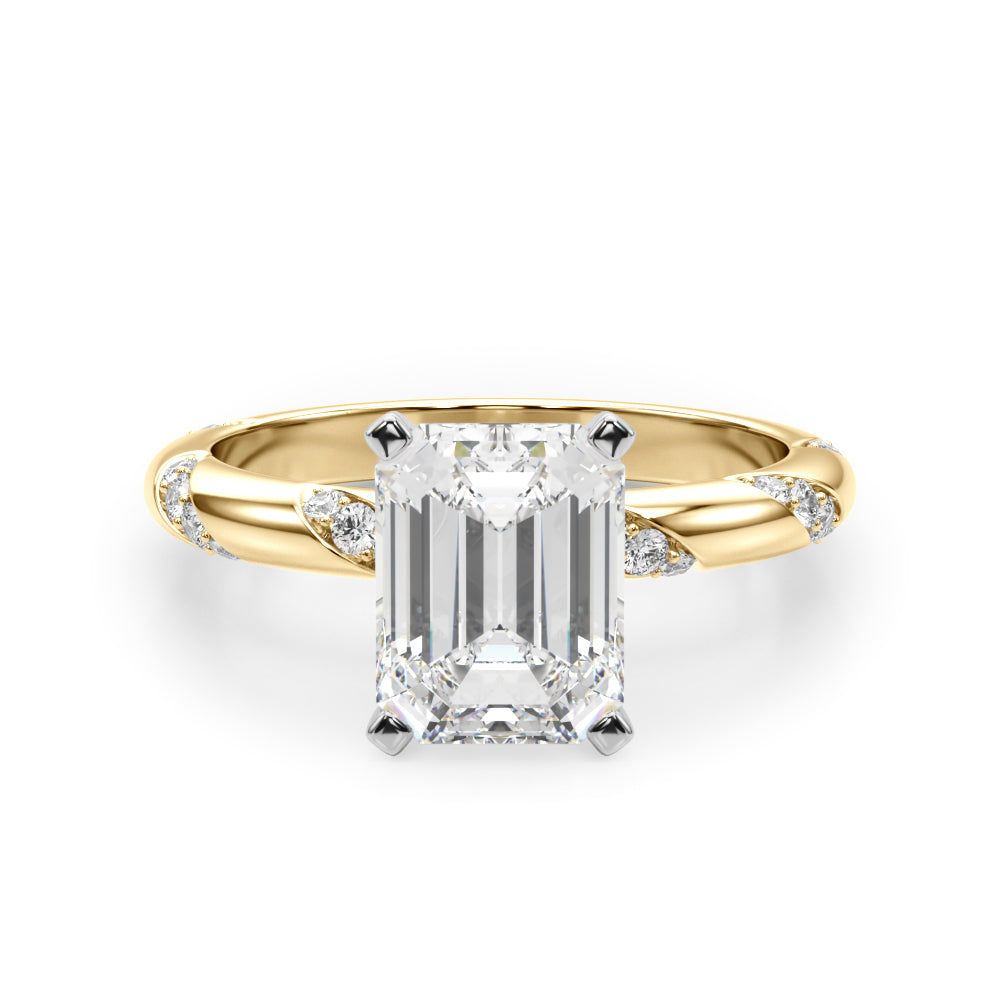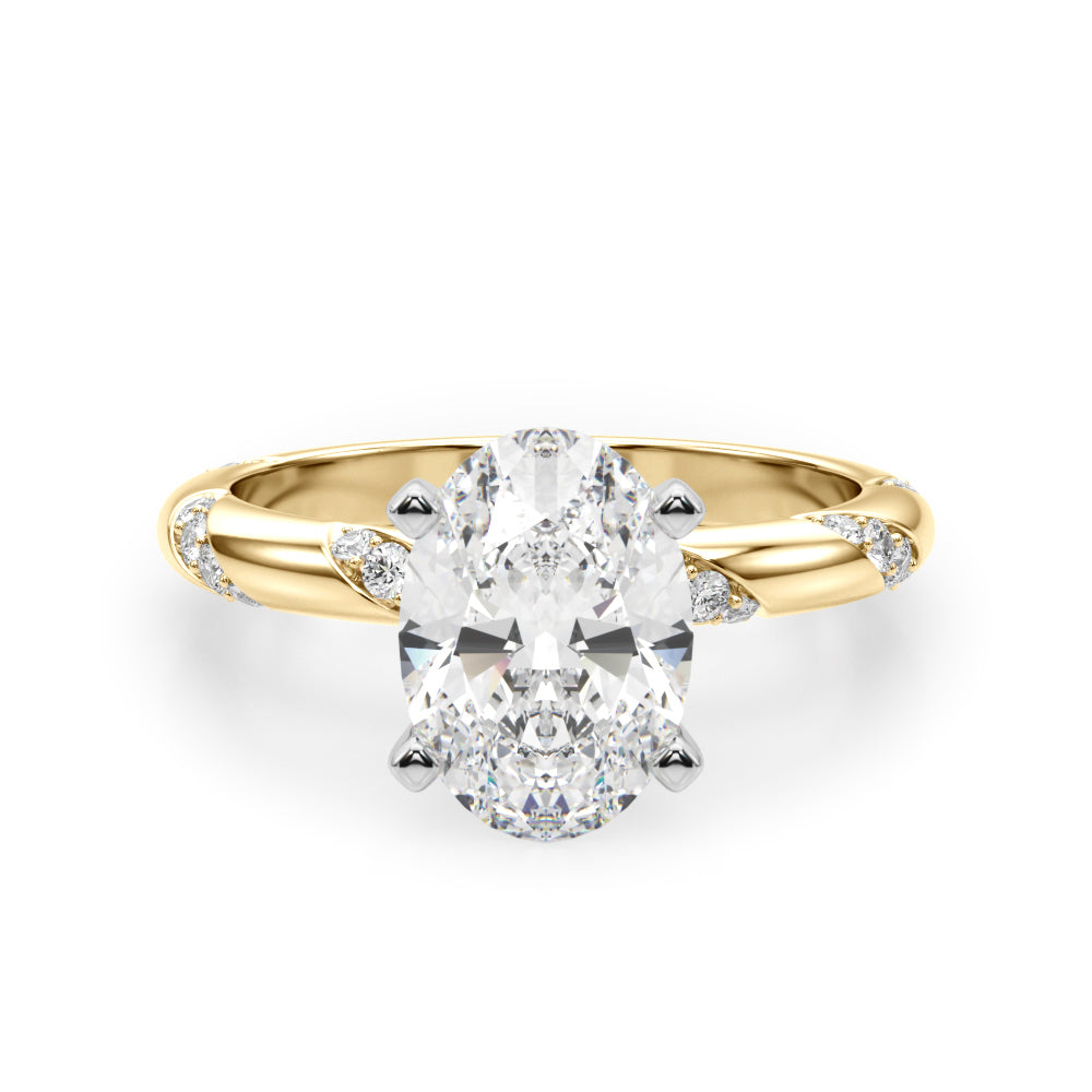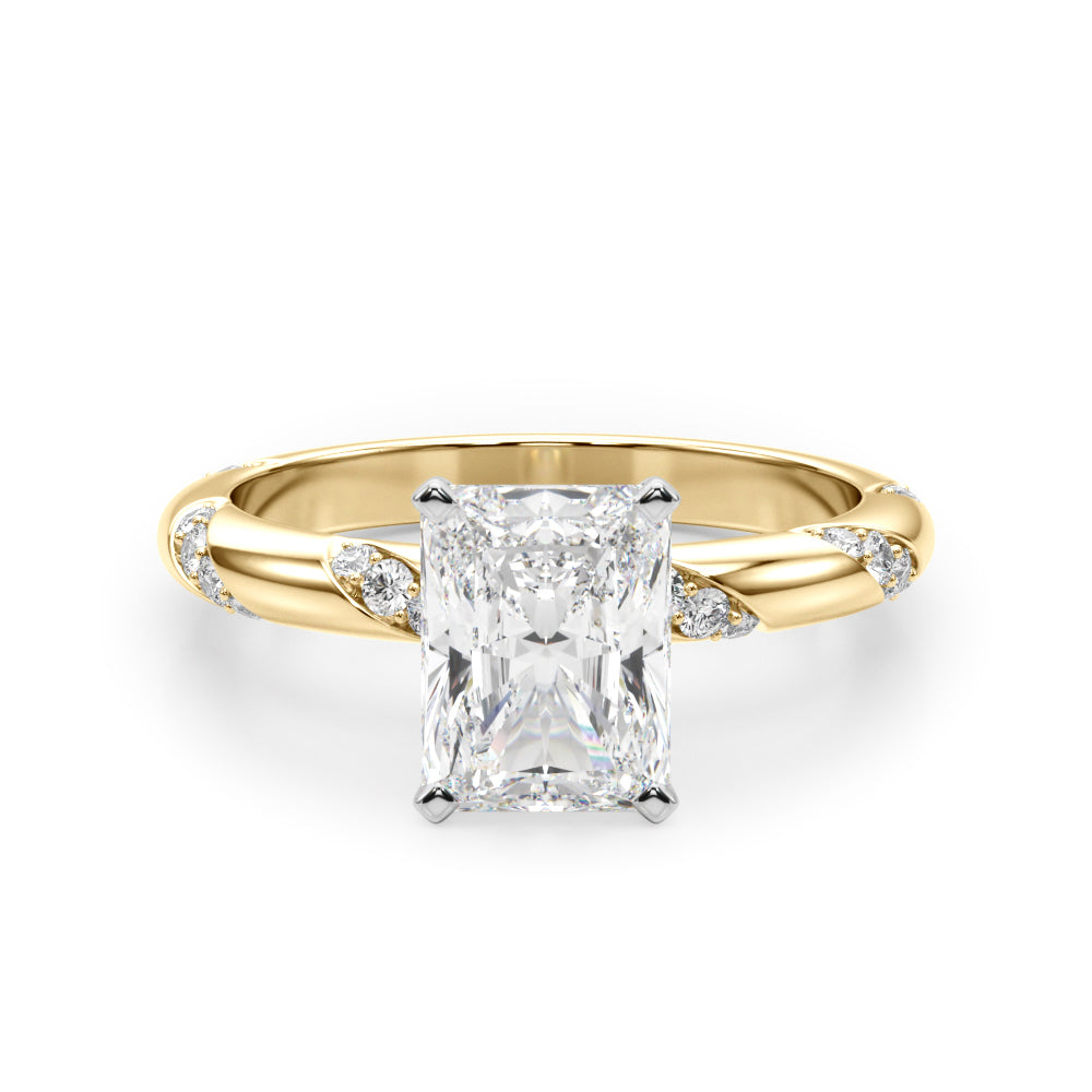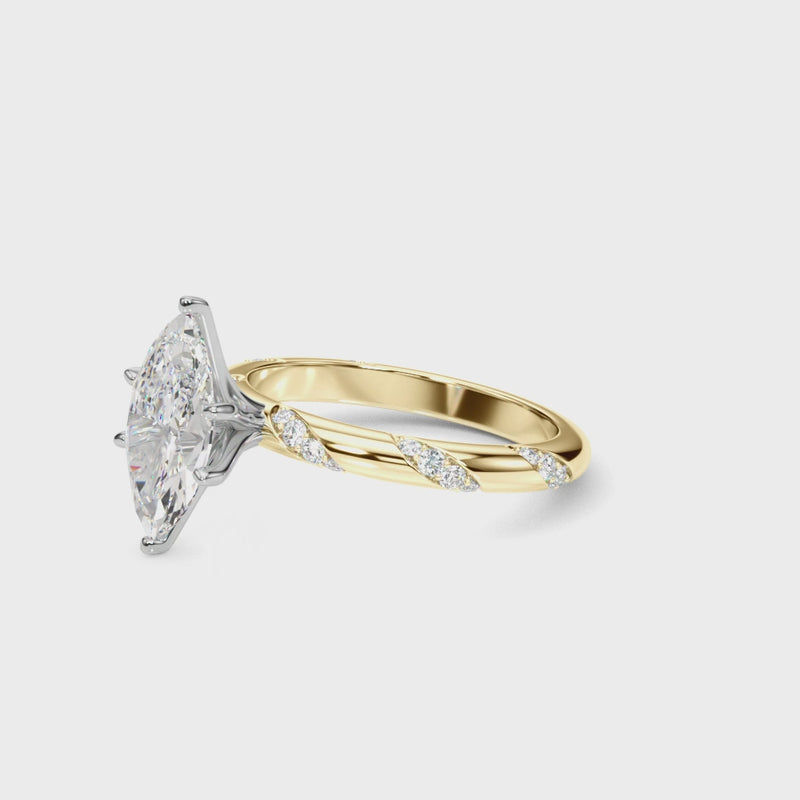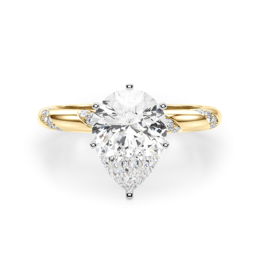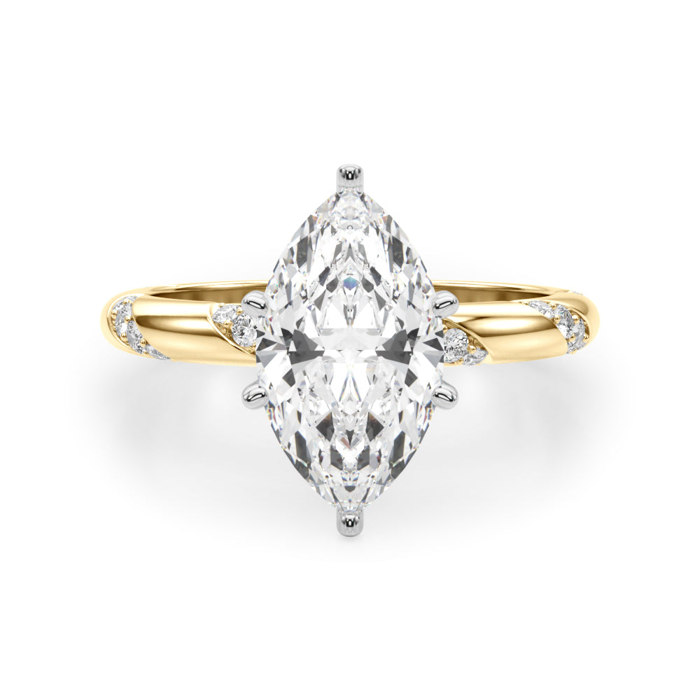 A graceful harmony of motion and brilliance, the Aurora Twist ring features a polished gold band with delicately angled diamond accents, reminiscent of a spiral of light. The sleek two-tone setting elevates the central stone, creating an eye-catching contrast that blends modern allure with timeless charm. A radiant expression of individuality and elegance.