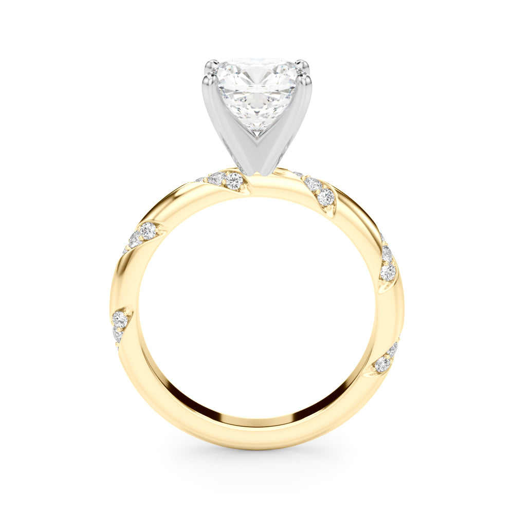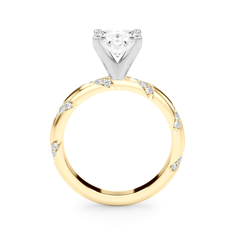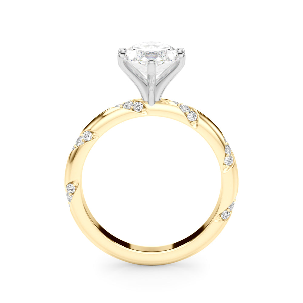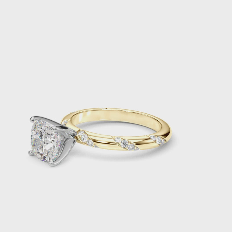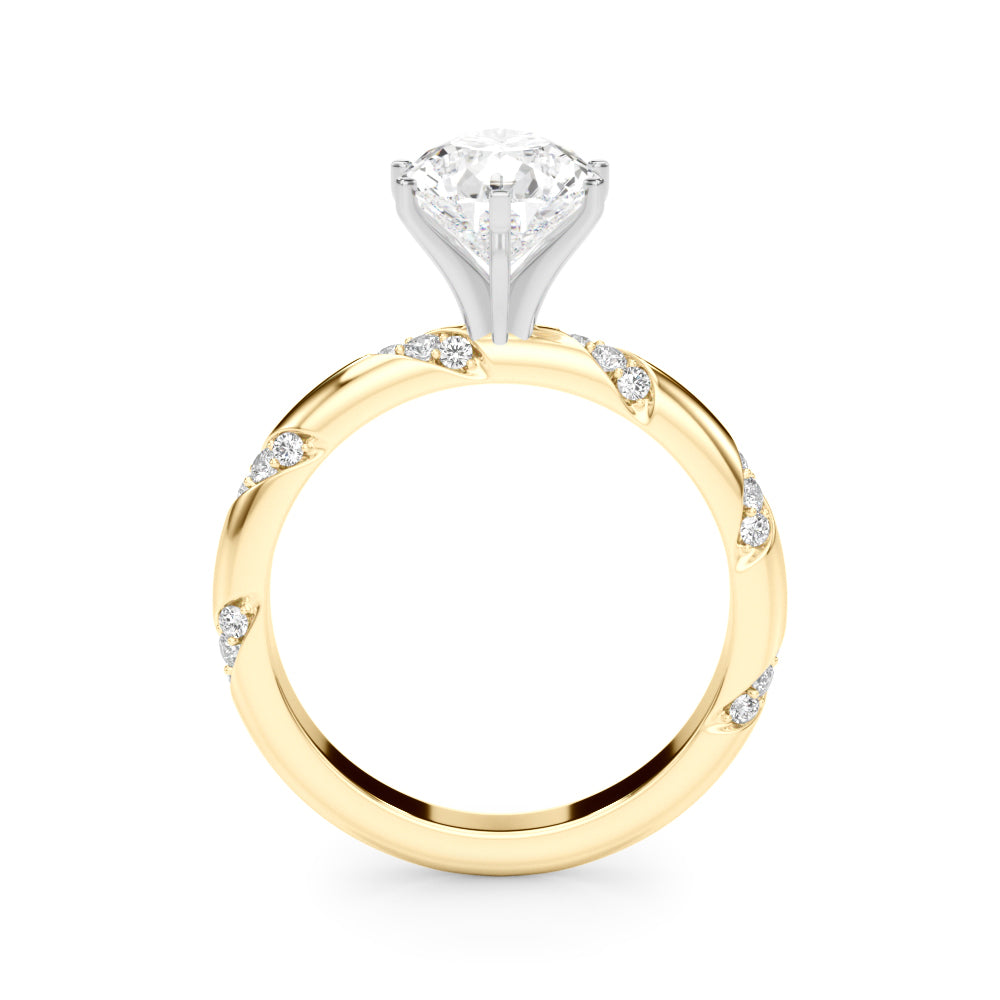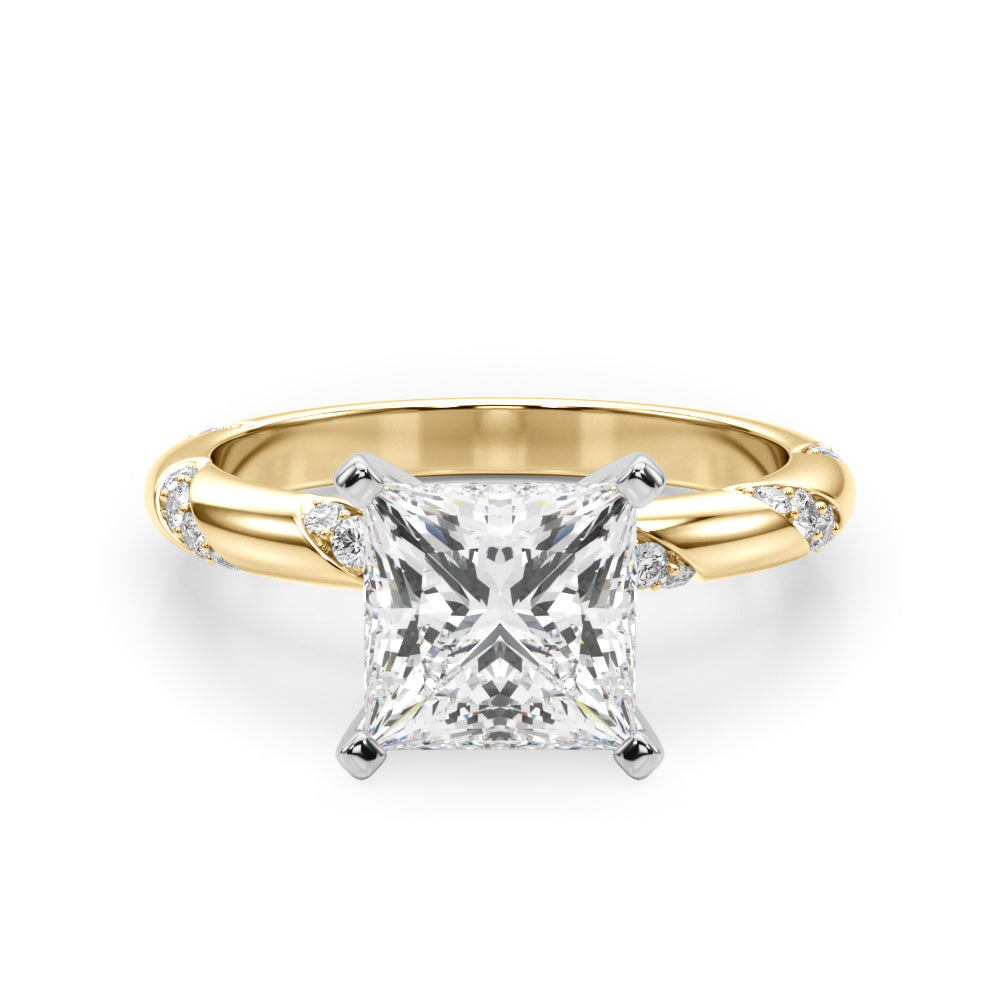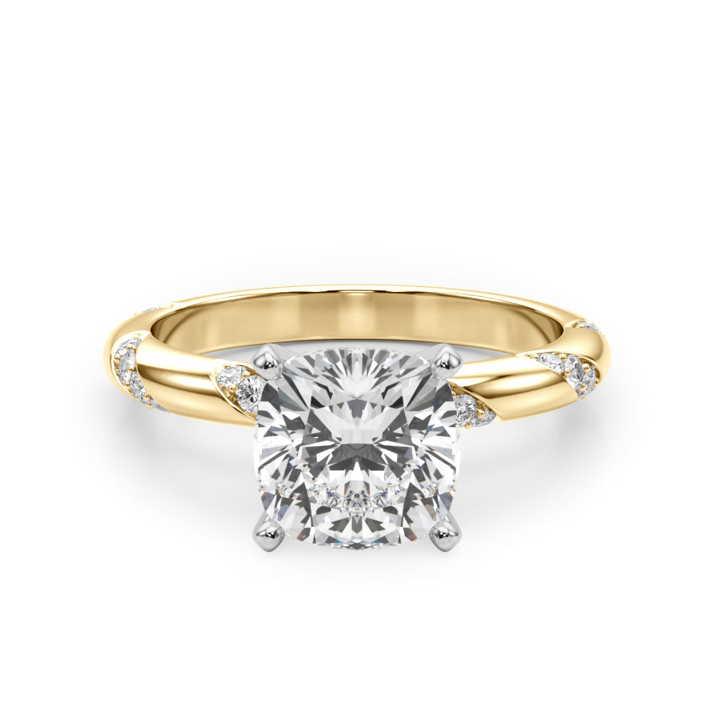 A graceful harmony of motion and brilliance, the Aurora Twist ring features a polished gold band with delicately angled diamond accents, reminiscent of a spiral of light. The sleek two-tone setting elevates the central stone, creating an eye-catching contrast that blends modern allure with timeless charm. A radiant expression of individuality and elegance.