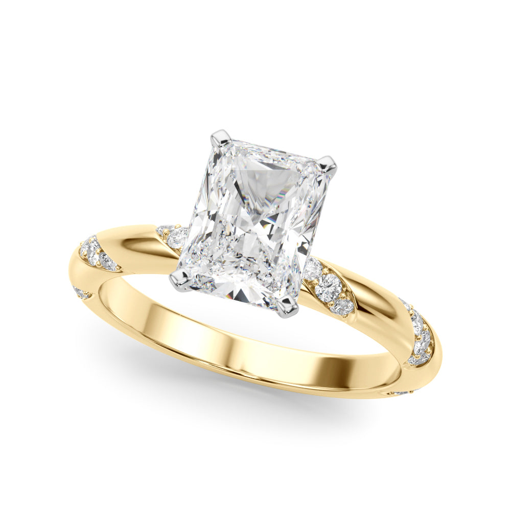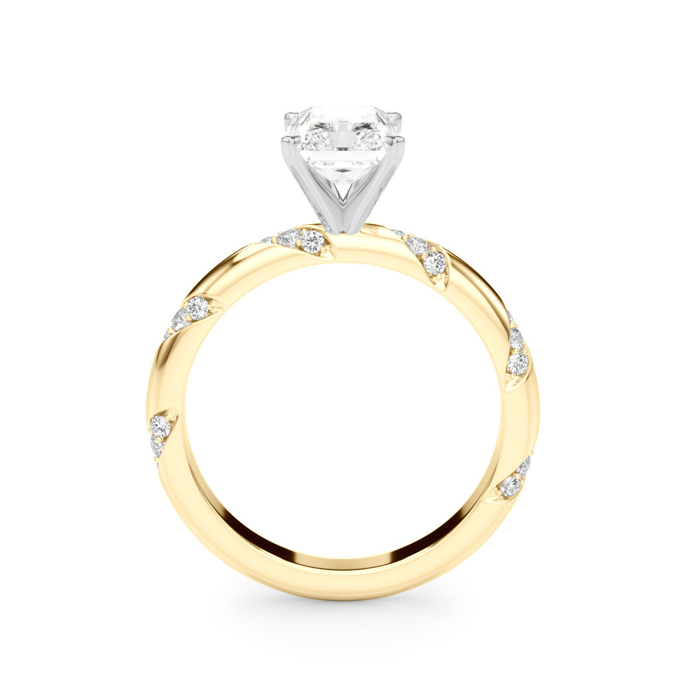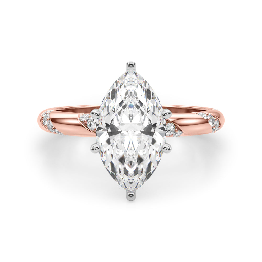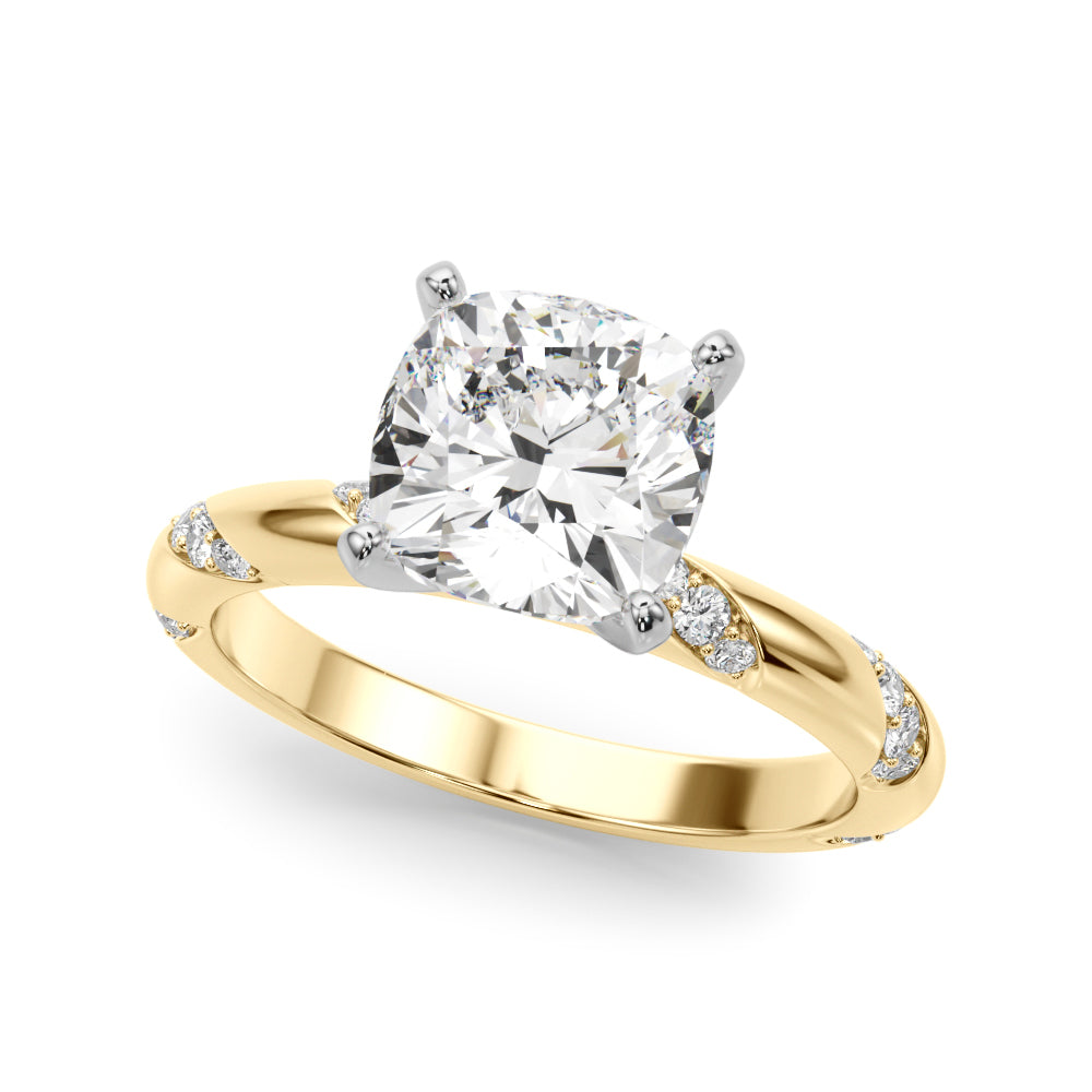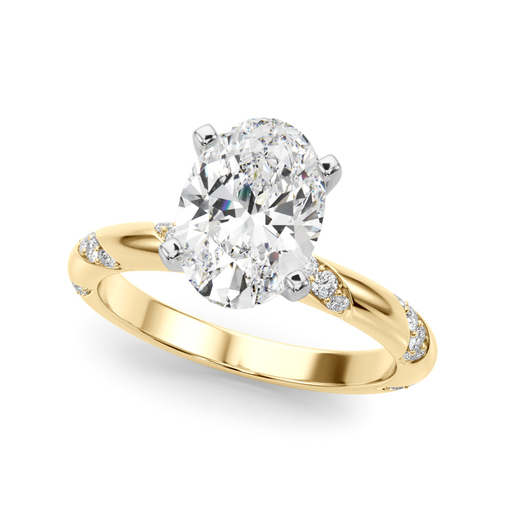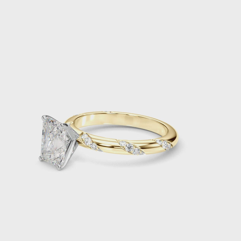 A graceful harmony of motion and brilliance, the Aurora Twist ring features a polished gold band with delicately angled diamond accents, reminiscent of a spiral of light. The sleek two-tone setting elevates the central stone, creating an eye-catching contrast that blends modern allure with timeless charm. A radiant expression of individuality and elegance.