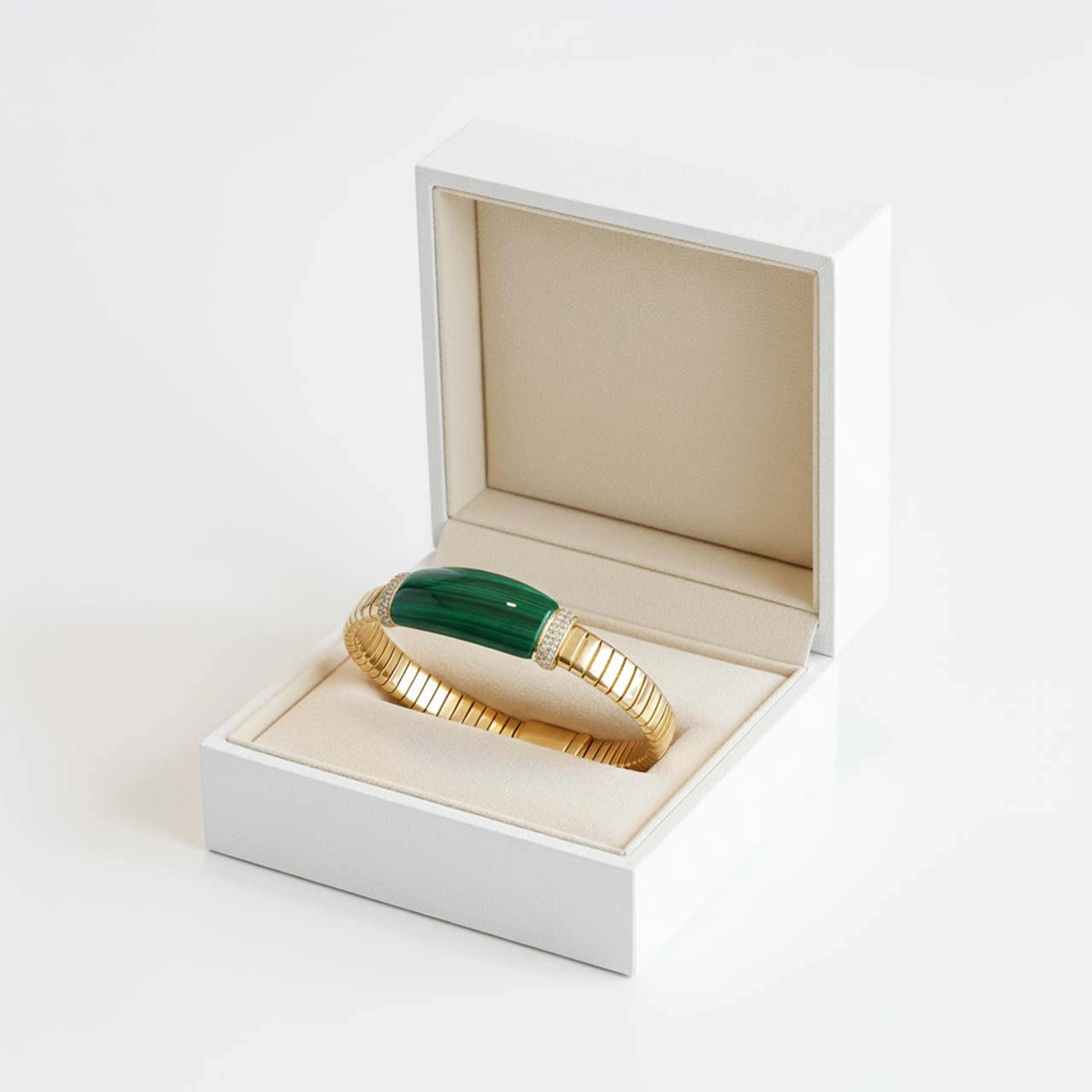 A masterpiece in gold featuring a rich malachite centerpiece framed by natural diamonds. Designed for women who embody strength in softness and find balance in beauty.