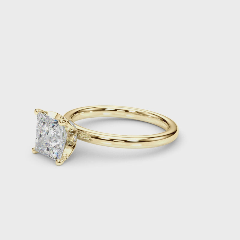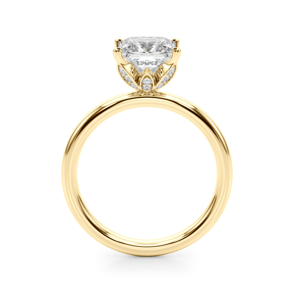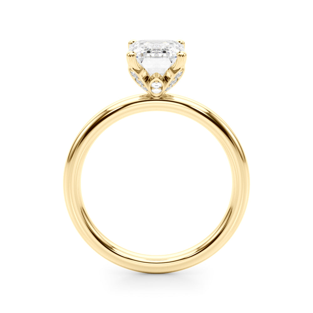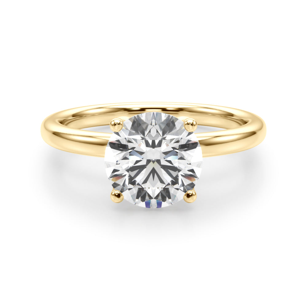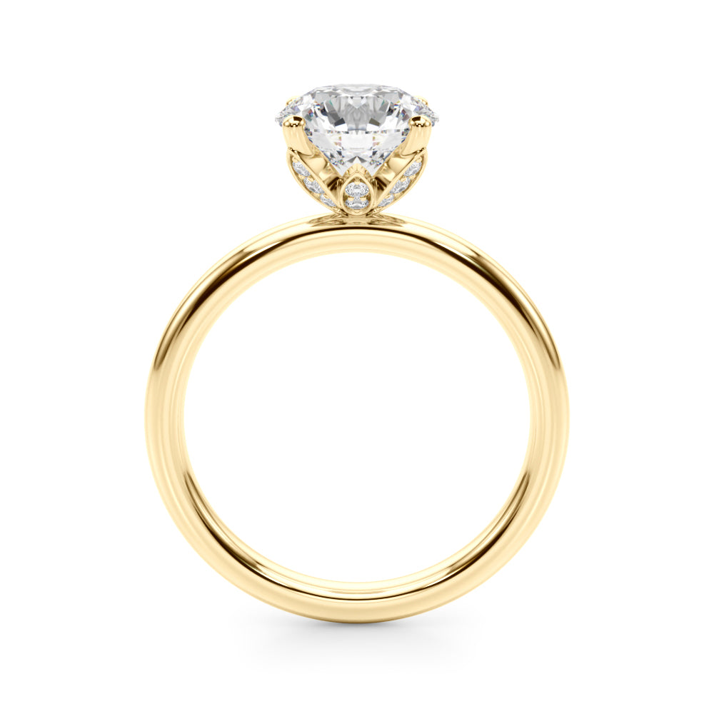 Classic elegance meets refined radiance in the Solis Charm ring. A single brilliant diamond rests in a timeless four-prong setting, elevated above a smooth, polished gold band. A hidden diamond detail beneath the center stone adds a subtle touch of intrigue—perfect for those who appreciate quiet luxury and enduring style.