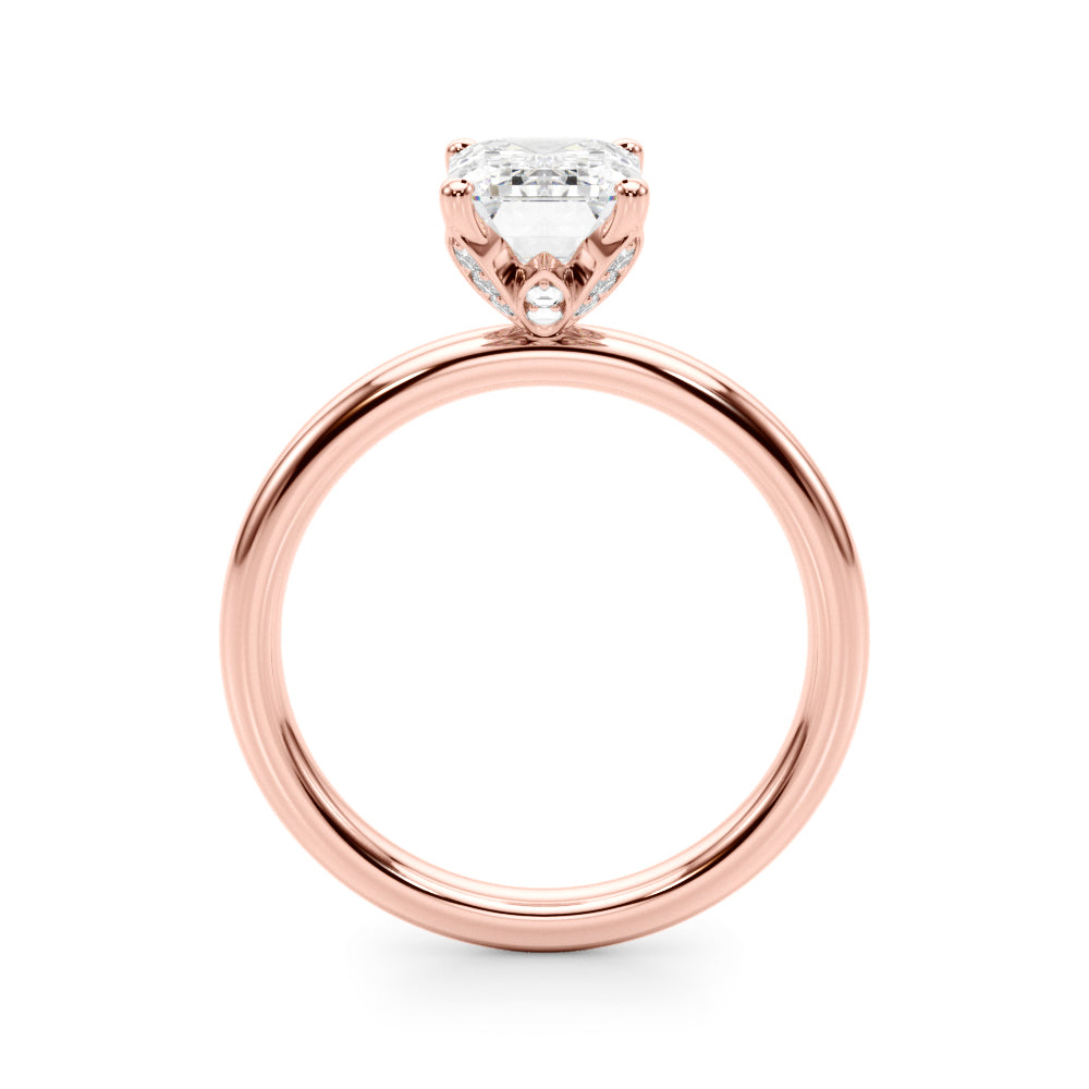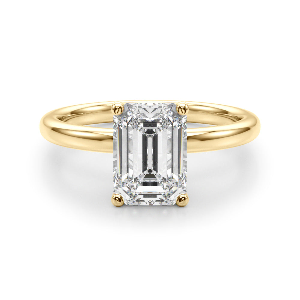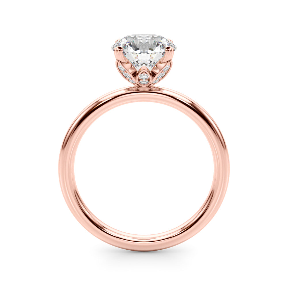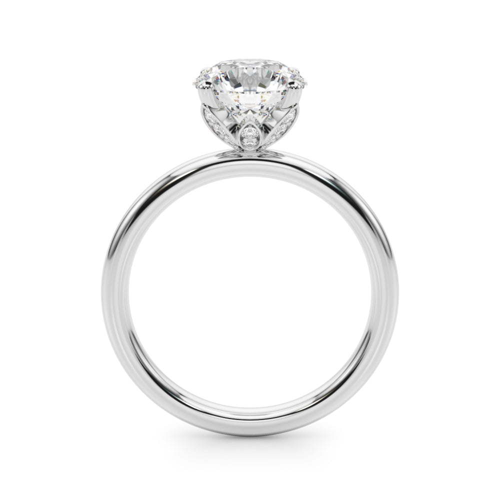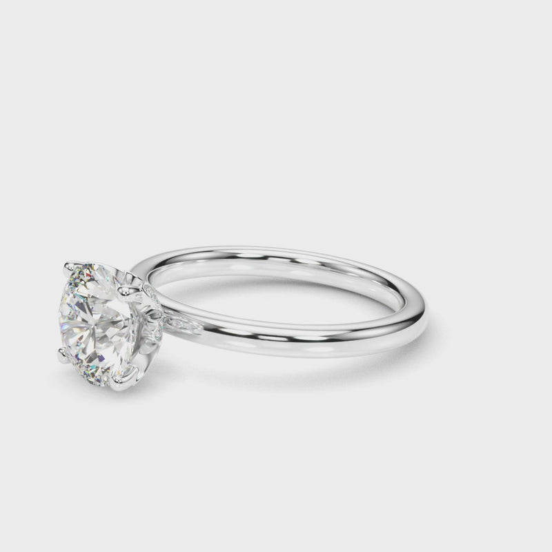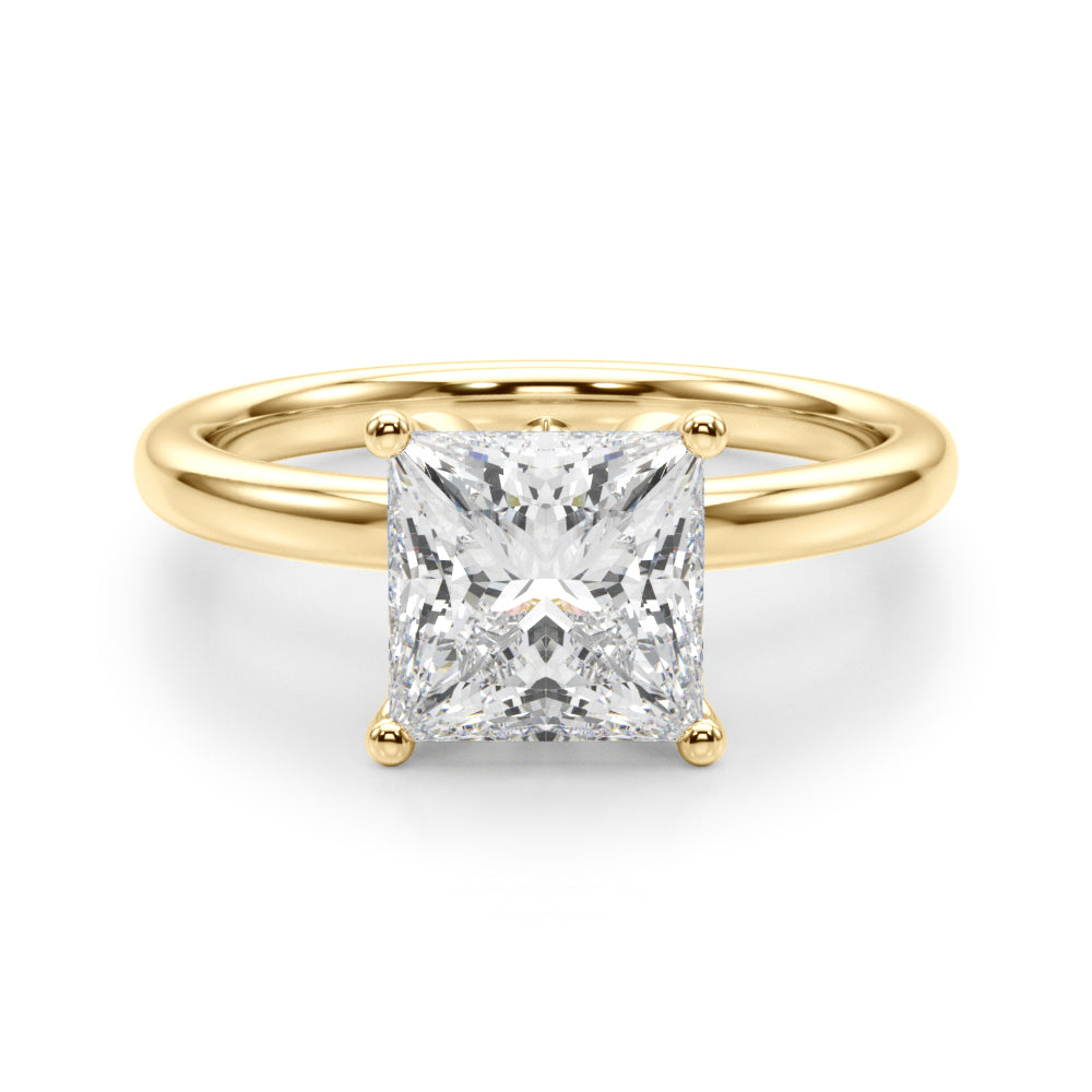 Classic elegance meets refined radiance in the Solis Charm ring. A single brilliant diamond rests in a timeless four-prong setting, elevated above a smooth, polished gold band. A hidden diamond detail beneath the center stone adds a subtle touch of intrigue—perfect for those who appreciate quiet luxury and enduring style.